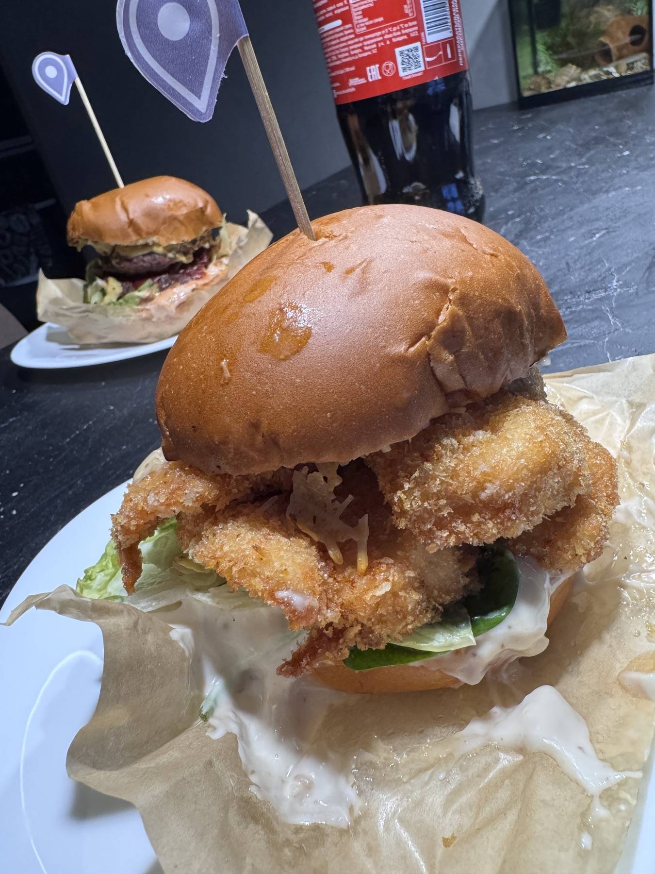 - бургер "Цезарь": булочка бриошь, соус "Цезарь", микс салат, куриное филе в панировке, помидоры черри, сыр сулугуни - 1 шт.