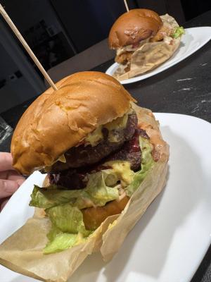 - бургер "Восточный": булочка бриошь, соус "1000 островов", микс салат, котлета из баранины (2 шт), помидоры черри, горчица муштарда - 1 шт.