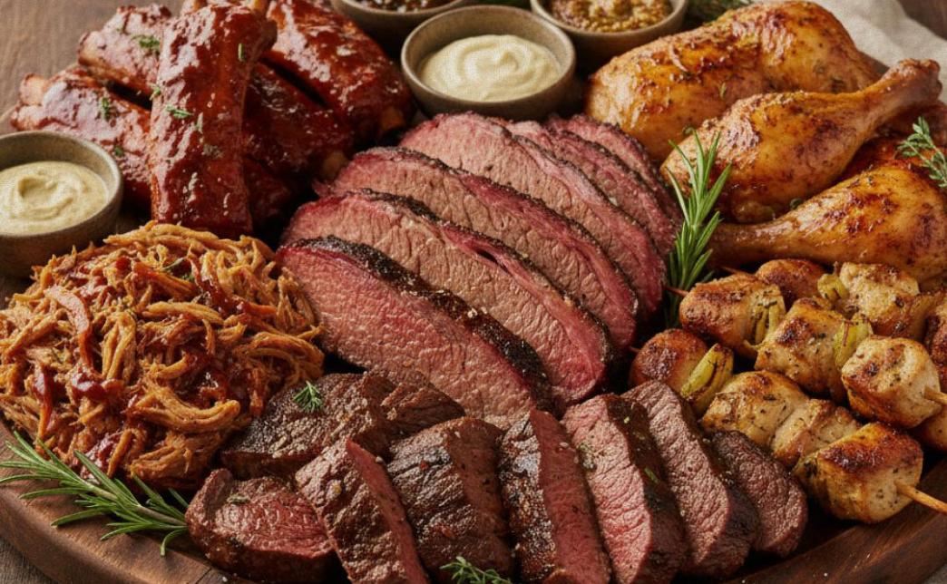Блюда: шашлык говяжий, шашлык свиной, мякоть куриного бедра в фирменном соусе