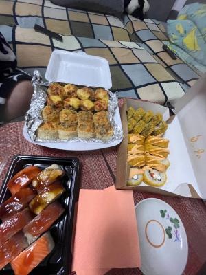 Приехали ровно -ровно в срок. Суши оказались очень большими,сытными и свежими.Запеченные суши были теплыми ,не смотря на то ,что не были в фольгированной упаковке.Нам все очень понравилось.