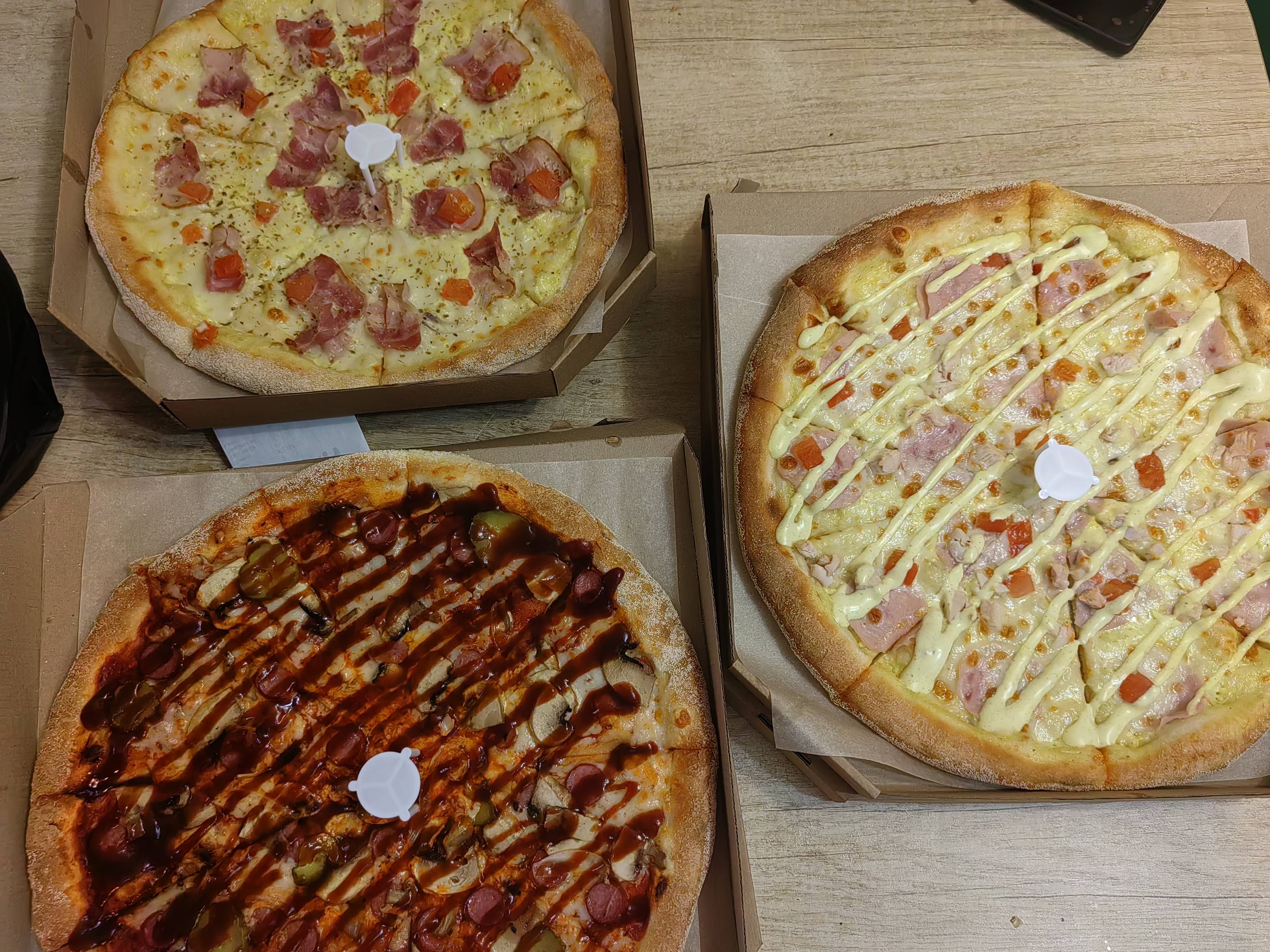 Пиццы 4шт ривезли совсем недавно, даже раньше на 5 минут. Пицца горячая, вкусная, начинки достаточно и тесто мне понравилось. Бортик без наполнителя съела с удовольствием. Рекомендую эту пиццерию