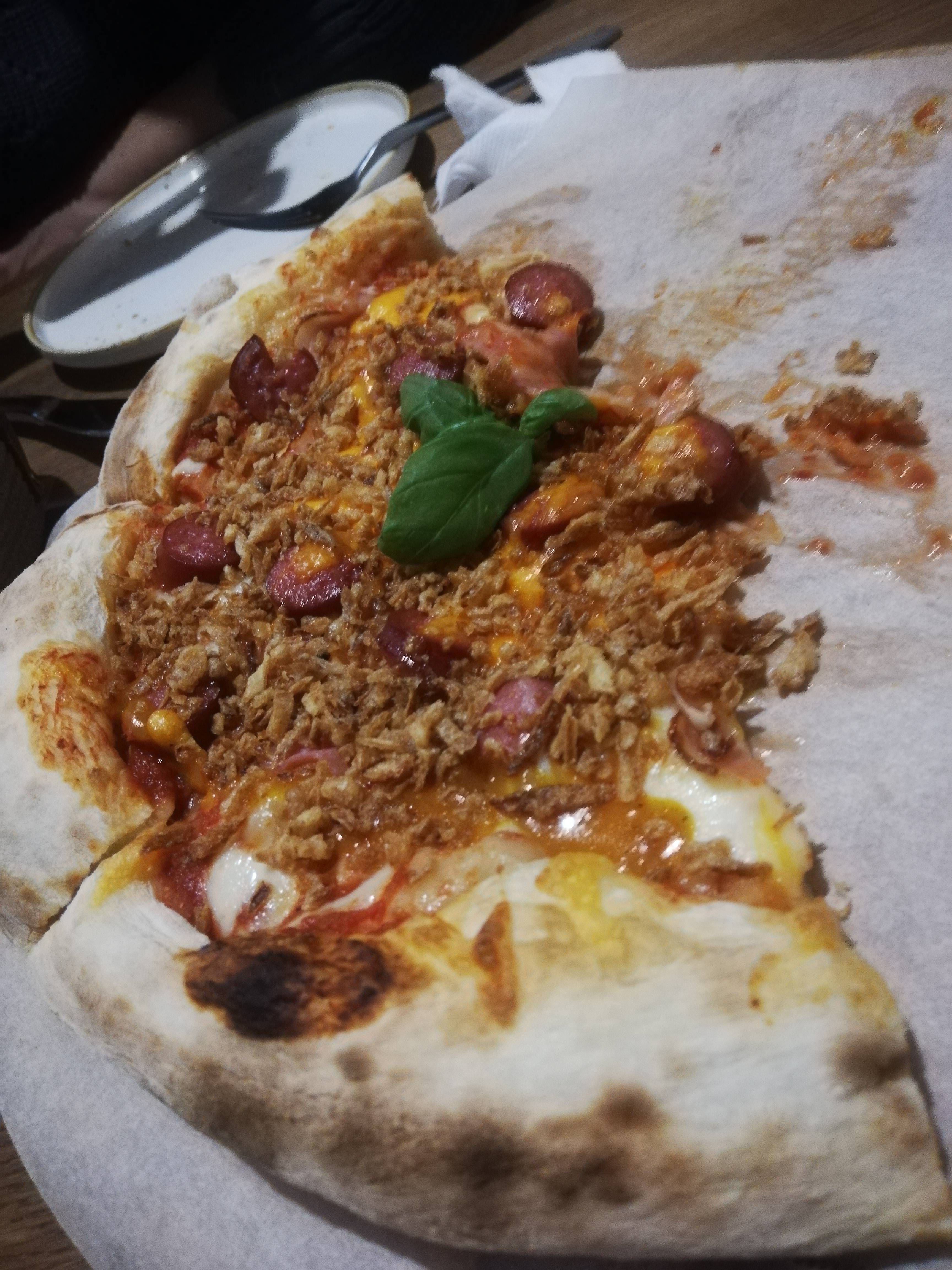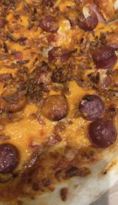 Состав: бекон, колбаски, сыр моцарелла, сыр чеддер, лук фри, соус томатный, соус карри