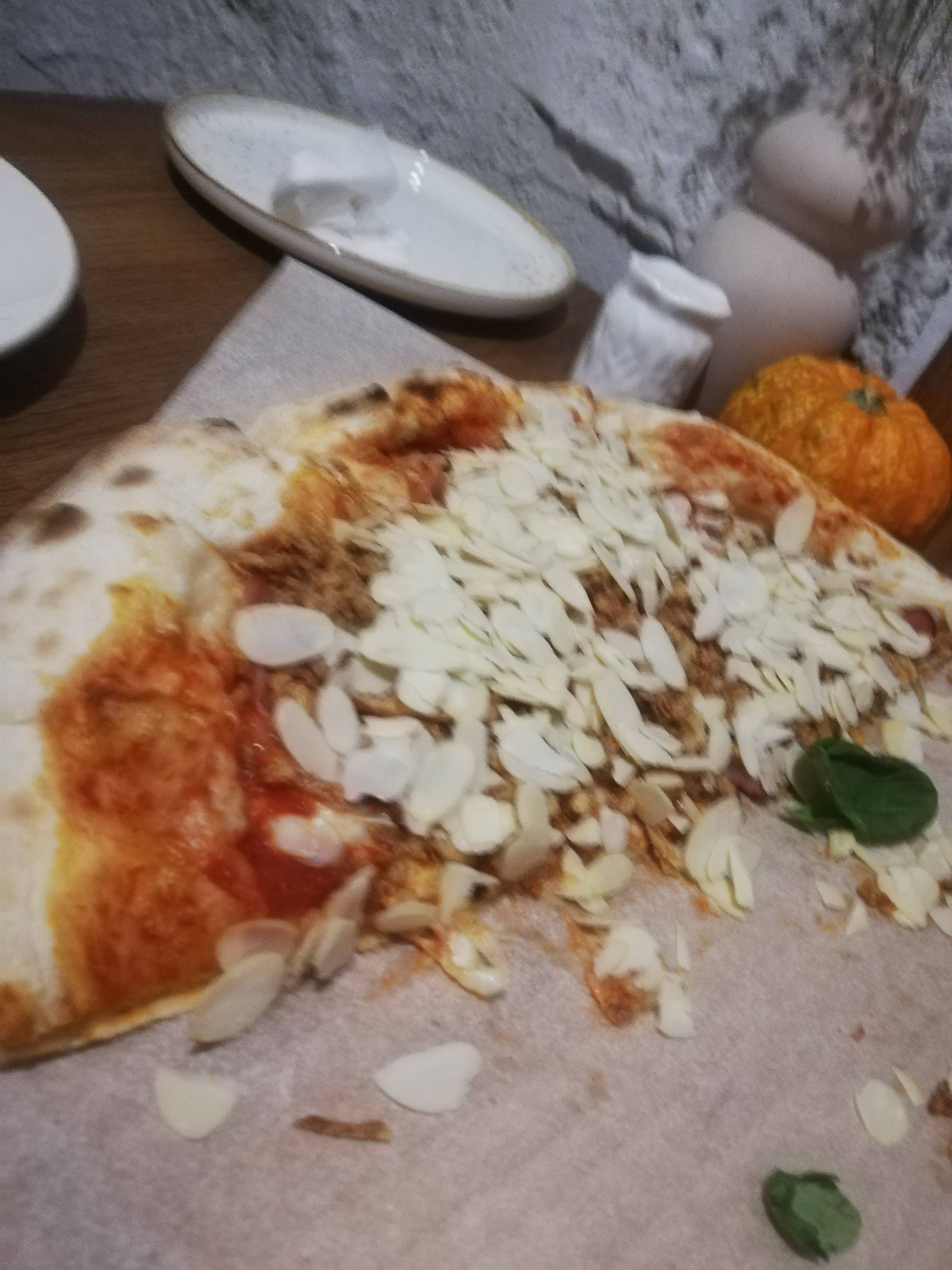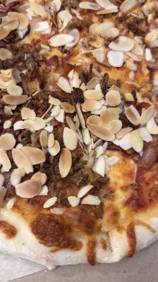 Состав: бекон, сыр моцарелла, сыр дор блю, миндаль, лук фри, базилик, соус томатный
