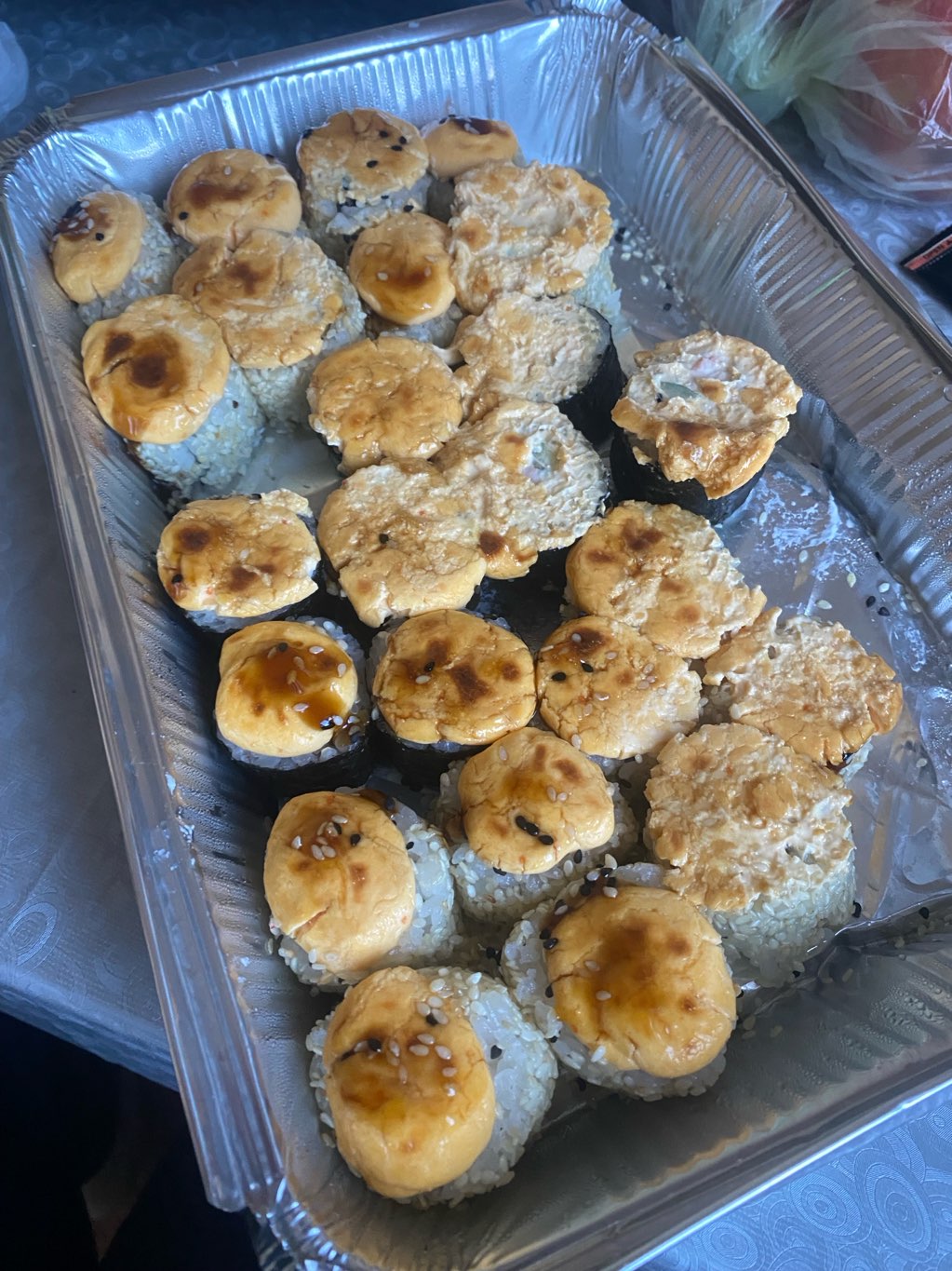 - ролл "Гриль лосось": рис, нори, огурец, сливочный сыр, лосось , соус унаги, кунжут, соус для запекания - 8 шт.