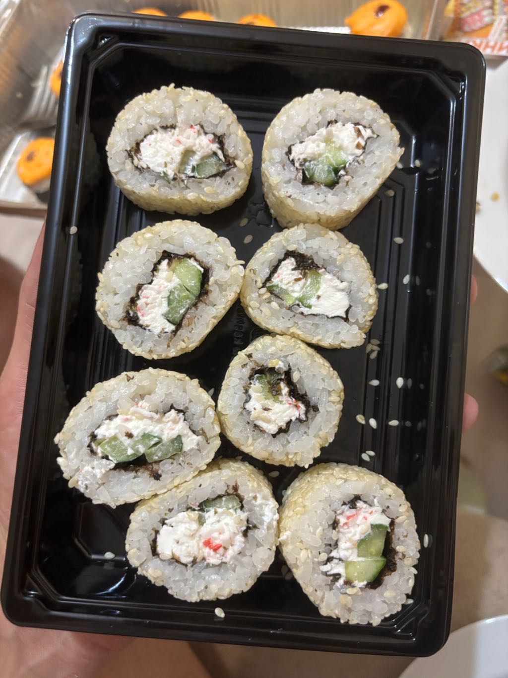 - ролл "Калифорния в кунжуте": рис, нори, сыр сливочный, огурец свежий, кунжут, снежный краб - 8 шт.