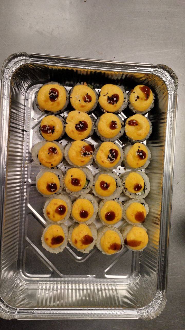 - ролл "Санрайз чикен": рис, водоросли нори, творожный сыр, филе курицы, слайсы чеддера, спайси соус - 8 шт.