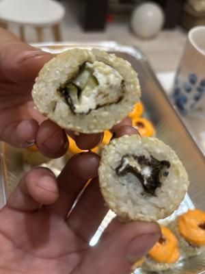 - ролл "Минхо": рис, нори, мидии, тигровые креветки, кунжут, сливочный сыр, огурец, соус для запекания - 8 шт.