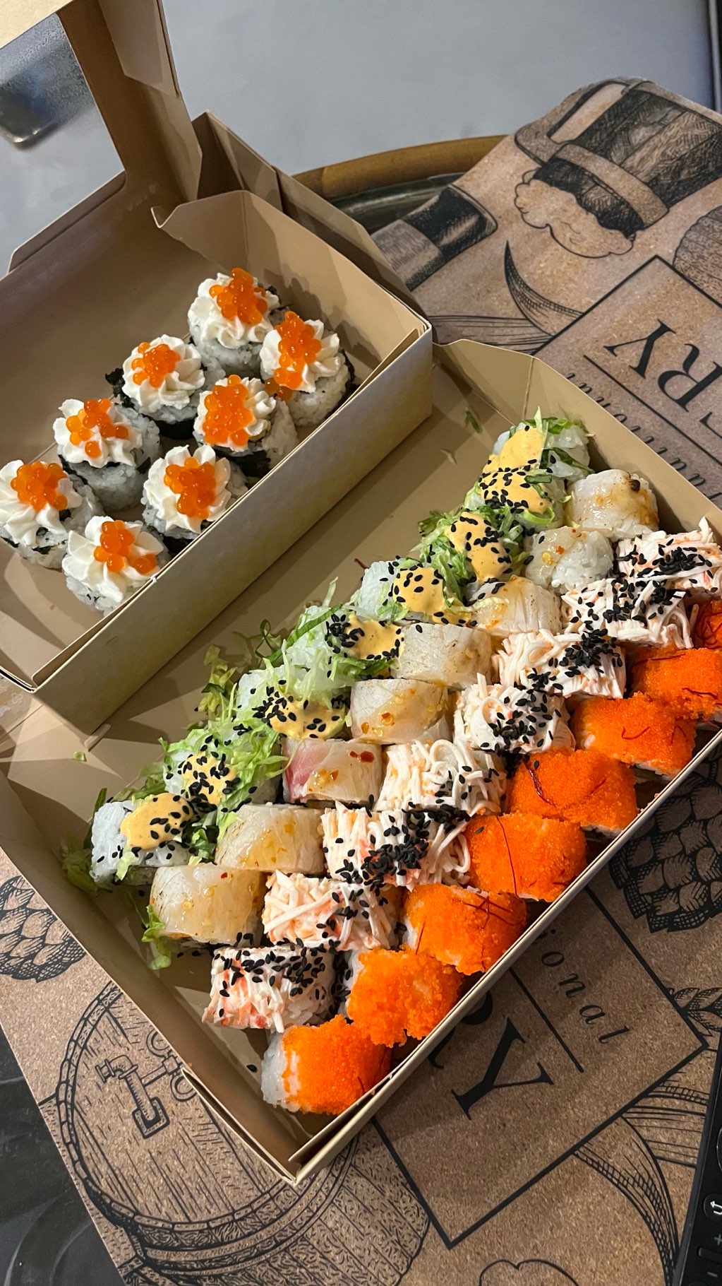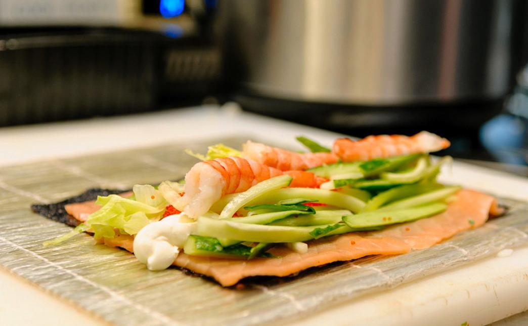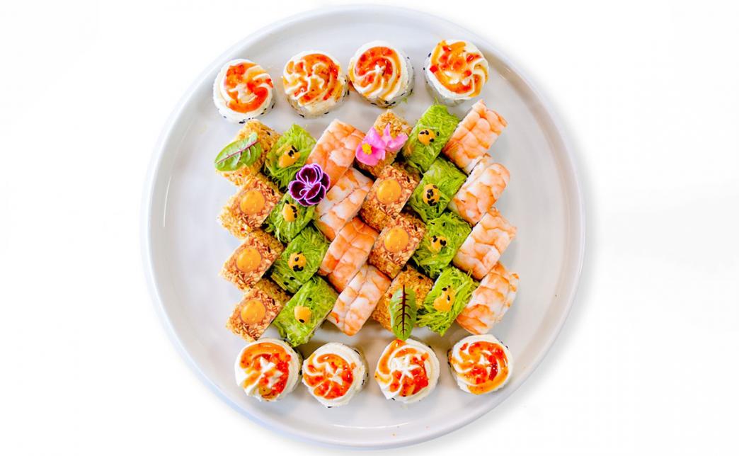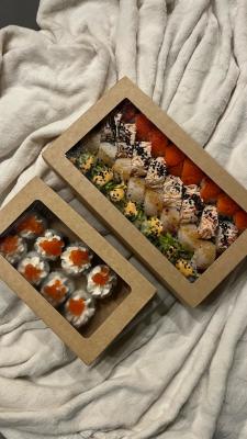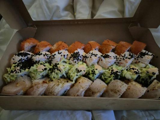 - ролл: микс копченого лосося и морского окуня, сливочный сыр, масаго, кунжут, салат айсберг - 8 шт.