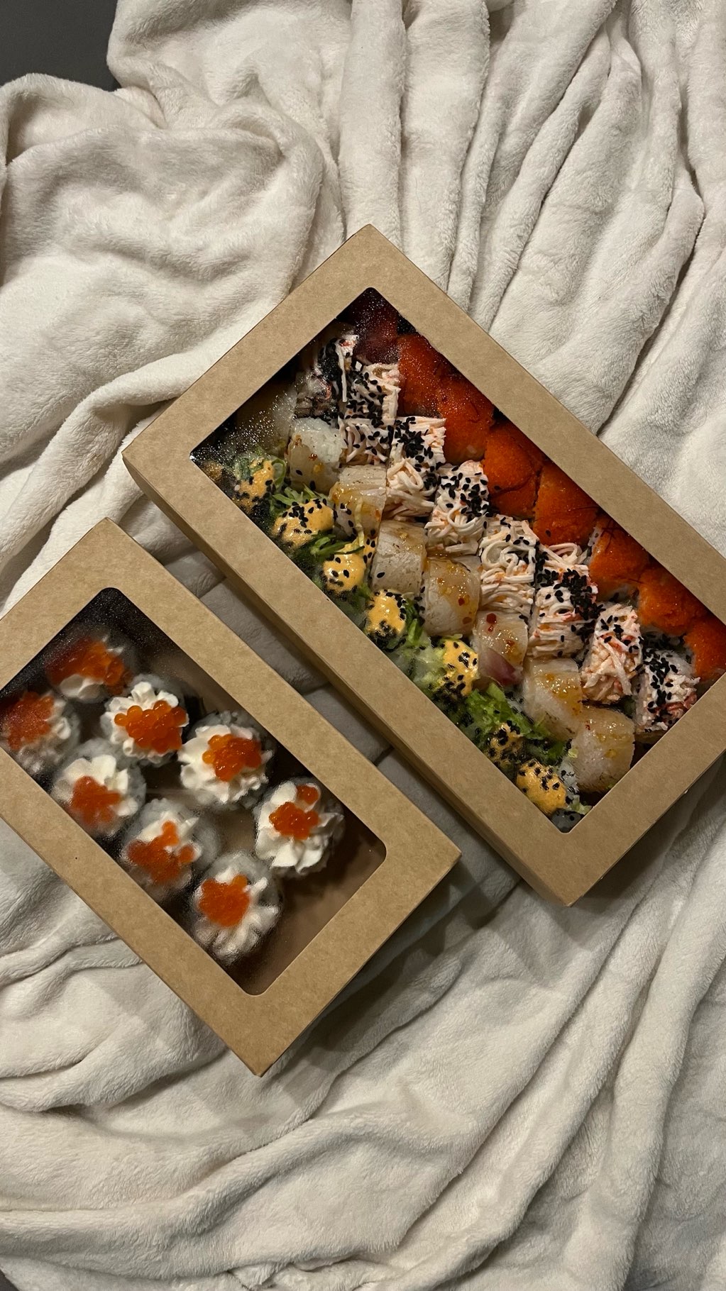 - ролл: лосось копченый, сыр сливочный, краб микс, огурец, кунжут микс - 8 шт.