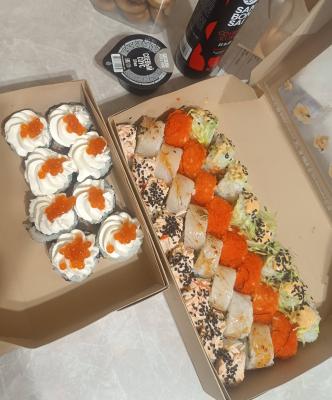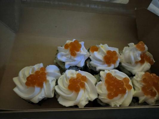 - ролл: лосось копченый, икра летучей рыбы, сыр сливочный, такуан, нити чили - 8 шт.