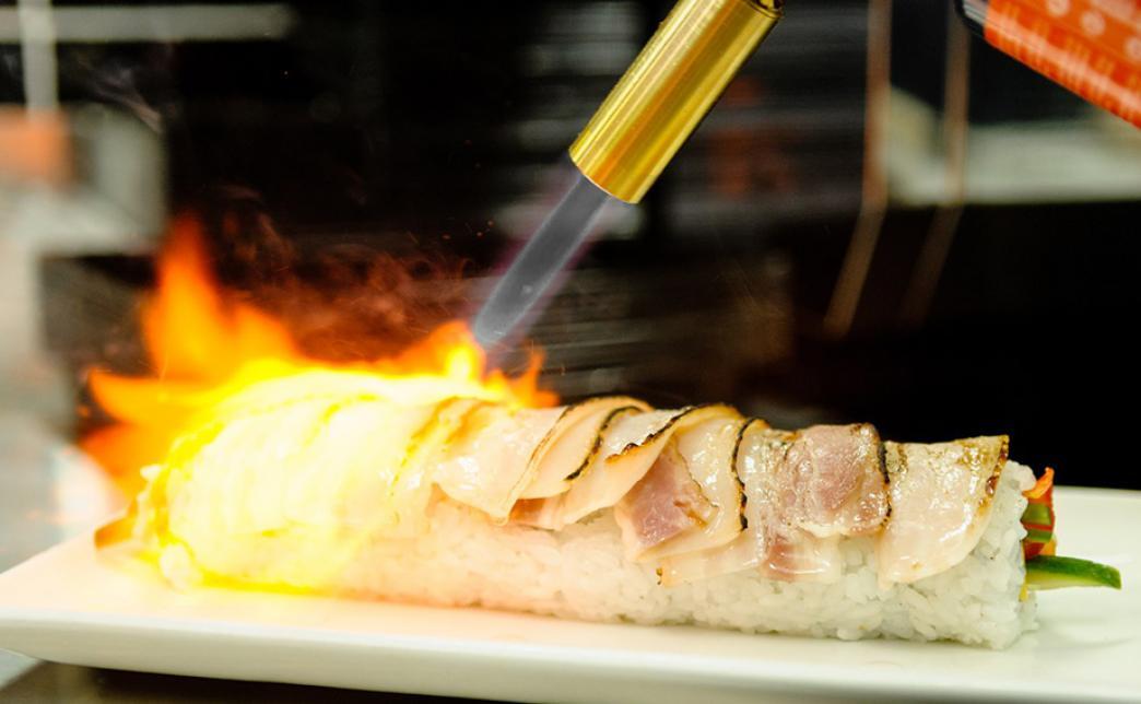 - ролл: морской окунь, темпура, японский омлет, грибы, соус спайси, такуан, сливочный сыр, соус - 8 шт.