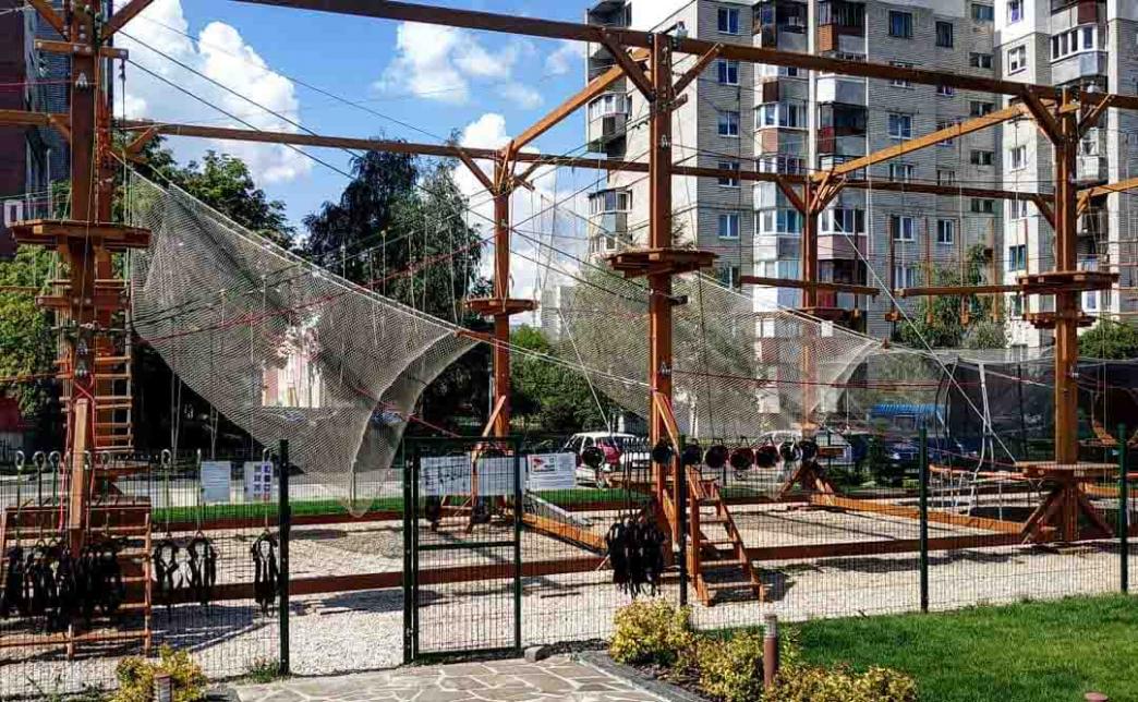 Веревочный парк с тремя трассами различной сложности для детей от 4-х лет и взрослых. Непрерывная система страховки, исключающая самостоятельное отстегивание от трассы.